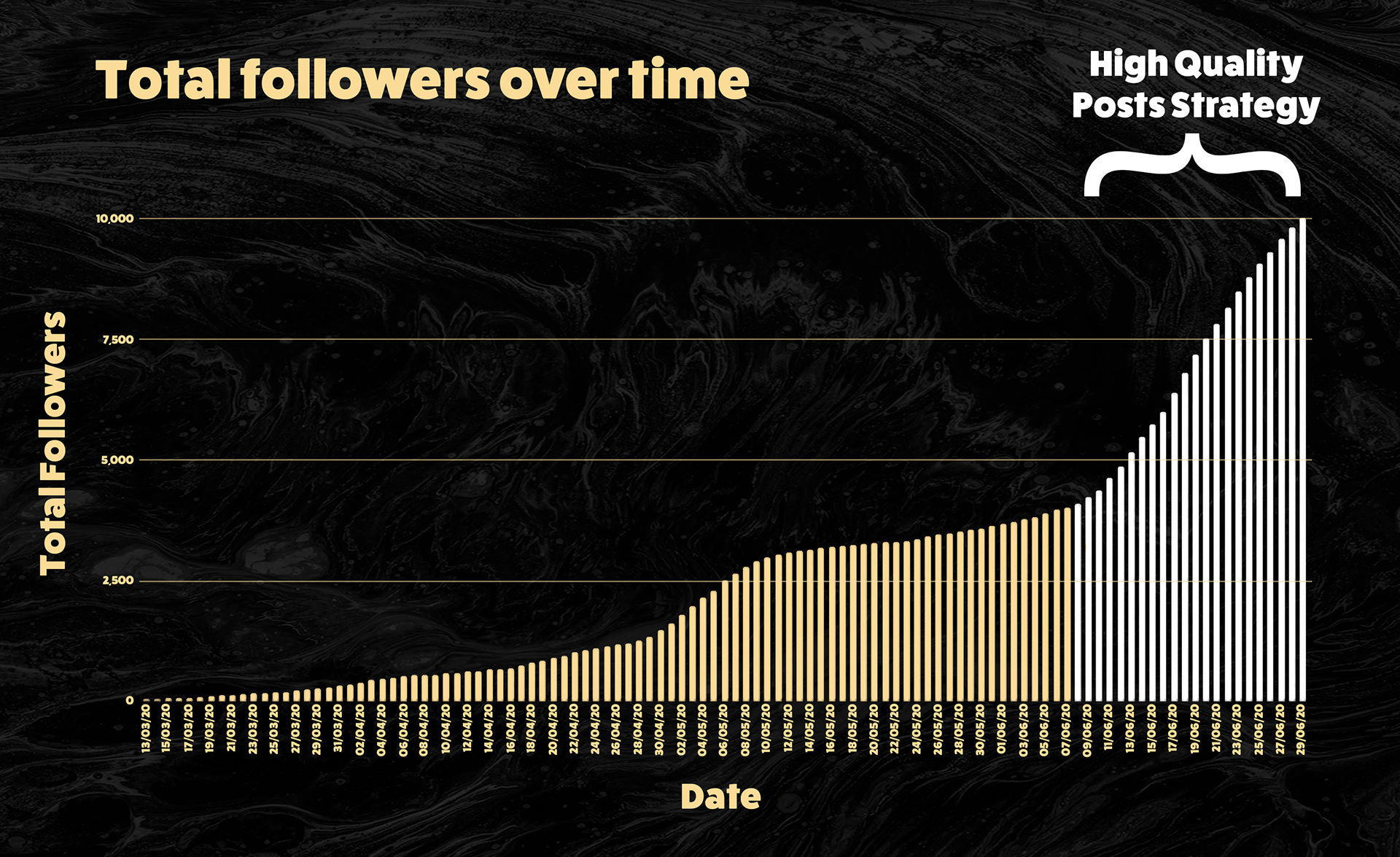 The chart above highlights the impact that the "high quality posts strategy" had on the MunchyMay account following over time. This graph features the entire time I spent on the project showcasing in white the results of this final strategies direct implementation.